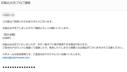 ギフトカード情報を入力すると、振込額が計算されますので、どれくらい振り込まれるのか、ここで確認しておきましょう。
