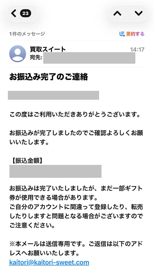 Amazonギフト券を買取スイートに申し込みしました。買取率は約80%、申込から約40分で振込完了メールが届き、スピーディーさに驚きました。