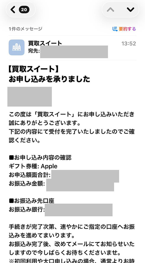 申込み完了後、買取スイートから「申込み受付メール」が届きます。